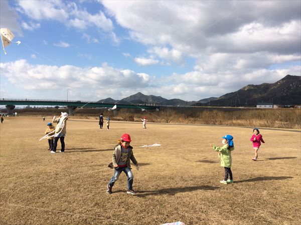 家内と二人してクルバス出勤の途中。河川敷で凧揚げ風景を発見!あっちたちでは?