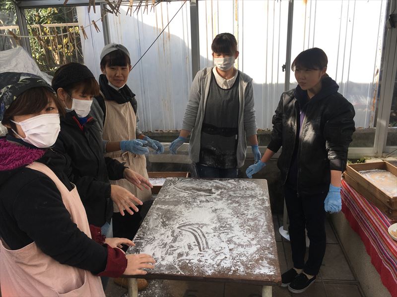 今まで家のキッチンで丸めてましたが、粉がすごいので、近い場所を確保。