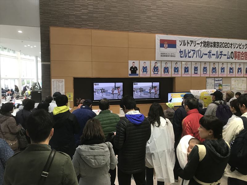 ソルトアリーナ内設置のテレビ。川内選手が先頭集団から抜け出すのはテレビでみて外でて一位で帰ってきたのは生で見ました。
