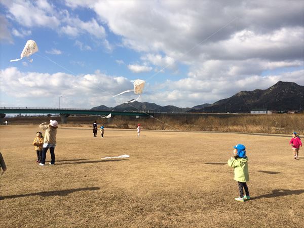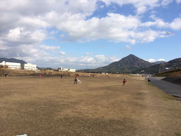家内と二人してクルバス出勤の途中。河川敷で凧揚げ風景を発見!あっちたちでは?