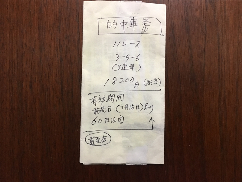後日、朝散歩するおじさんが、全く同じような”的中車券”の包みを拾ったと言ってました。