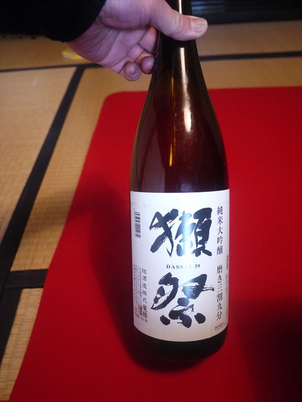 3割9分の獺祭と、とって置きという日本酒。先に飲んだ人が「甘口で辛口」とか?一口呑んで見ると!ほんとこれは甘い口当たりで後味がキリっとからい。先に飲んだ獺祭が果てしなく薄らいだ。後で調べたら、この酒、酒蔵限定販売らしく、普通に売ってない。こんなものがあるんですね。。。
