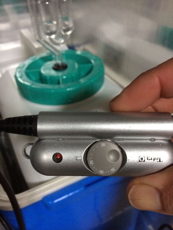 今回から水に浮かべてサーモスタットで水温管理にしました!