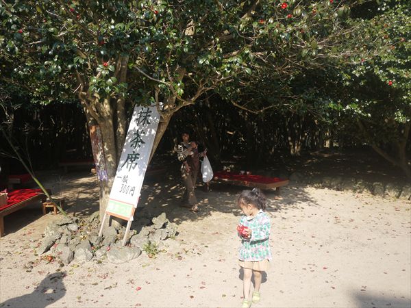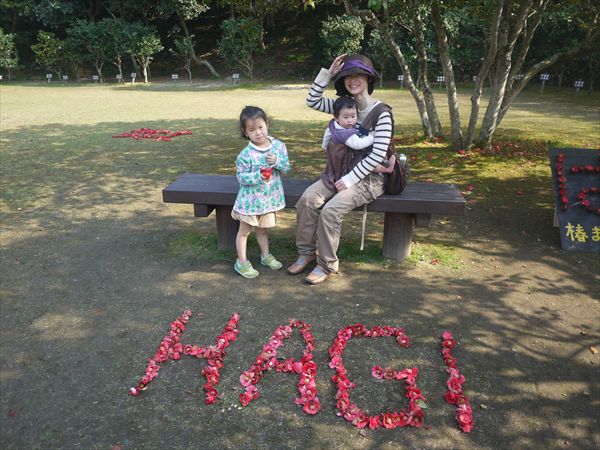 椿の木の白色と花の赤、その色のコントラストがすごい、萩の椿まつりへ。