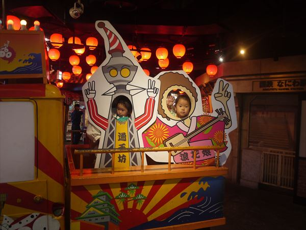 B級グルメ街にてツマミとビールで休憩する子連れ一家の図。