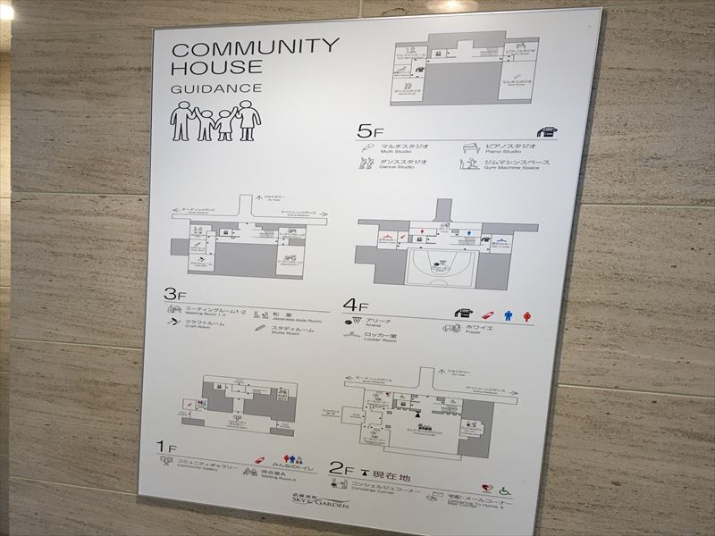 エントランスが2階個々にはゲストルームが3つ。4階には体育館(アリーナ)、5階にはダンススタジオやピアノスタジオ、ジムマシンスペースまであります。