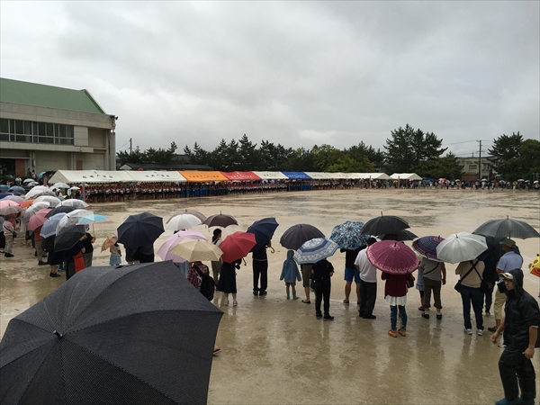 結局、テントの中で応援合戦。その後低学年、中学年、高学年がそれぞれ1つずつ雨の中競技をおこない、午前中で終了。