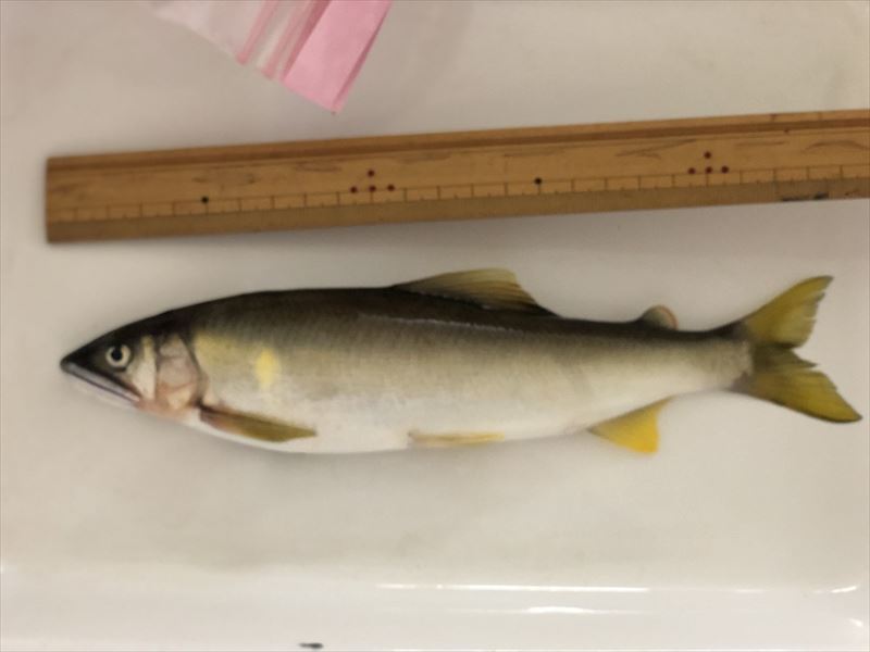 ここは小野一本松のいでから下った2つの川が合流するところ。今年はこの辺りの鮎が大きいというので調査。翌日捕ったのが下の鮎。